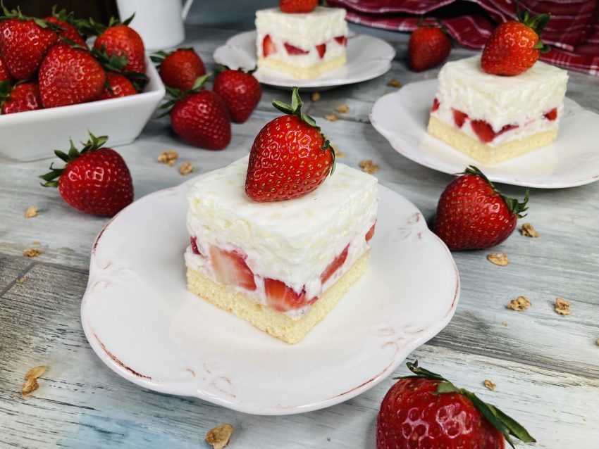 - Amikor megszilárdult a krém, a süteményt tetszőleges szeletekre vágjuk és friss eperrel tálaljuk.